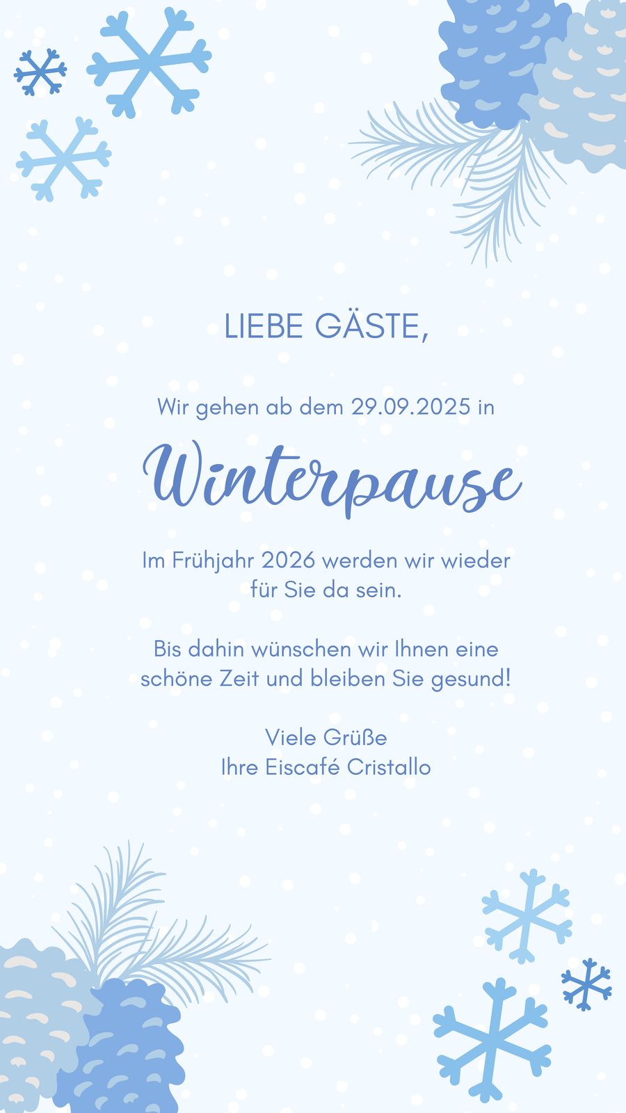 ab dem 09.12. geht auch das Eiscafé Corallo in die Winterpause. Im Frühjahr 2025 sind wir wieder für Sie da.